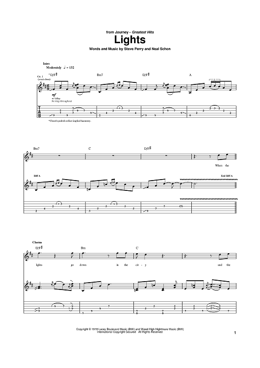 Digital Sheet Music for Lights by Steve Perry, Neal Schon, Journey scored for Guitar Tab; id:374465