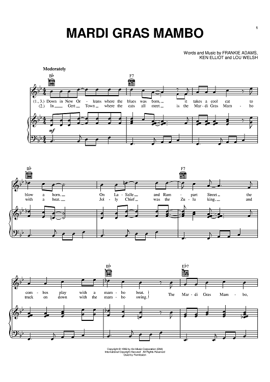 Digital Sheet Music for Mardi Gras Mambo by Frankie Adams, Ken Elliot, The Hawkettes, Lou Welsh scored for Piano/Vocal/Chords; id:383739