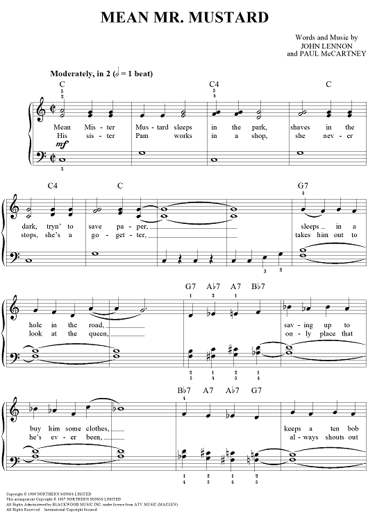 Digital Sheet Music for Mean Mr. Mustard by Paul McCartney, The Beatles, John Lennon scored for Easy Piano/Vocal/Chords; id:448680