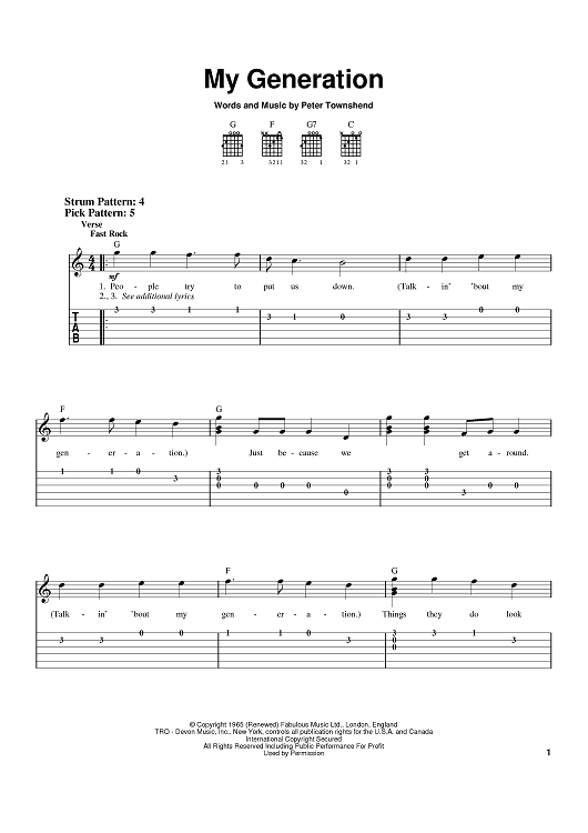 Digital Sheet Music for My Generation by The Who, Peter Townshend scored for Easy Guitar; id:370208