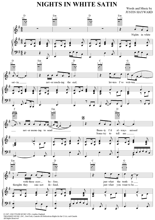 Digital Sheet Music for Nights in White Satin by Justin Hayward, Moody Blues scored for Piano/Vocal/Chords; id:266956