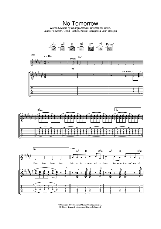 Digital Sheet Music for No Tomorrow by George Astasio, John Bentjen, Christopher Cano, Orson, Jason Pebworth, Chad Rachild, Kevin Roentgen scored for Guitar Tab; id:391425