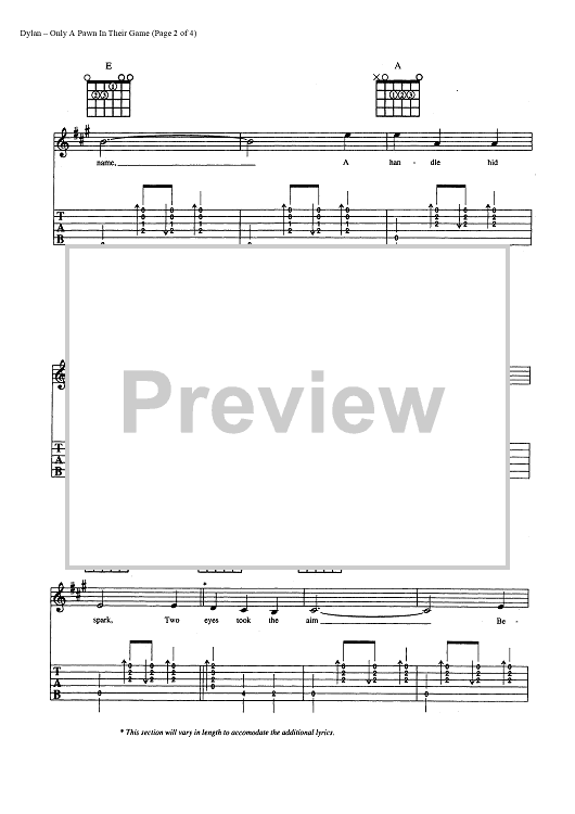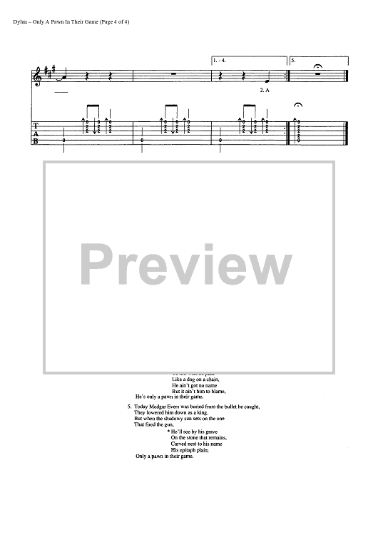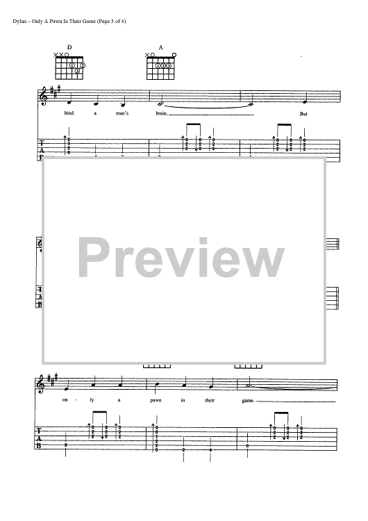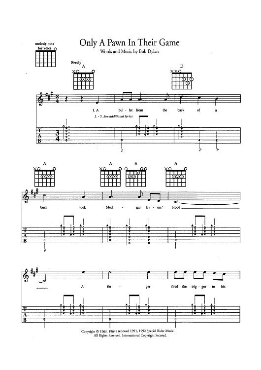 Digital Sheet Music for Only a Pawn in Their Game by Bob Dylan scored for Guitar Tab/Vocal/Chords; id:445397