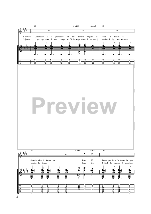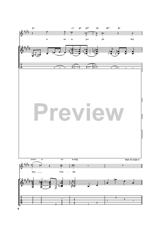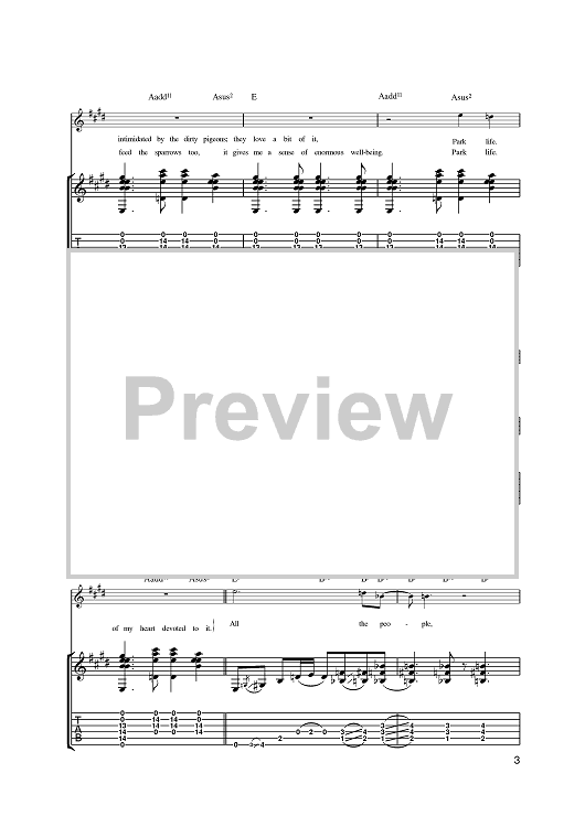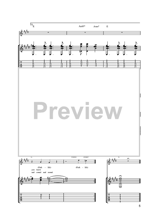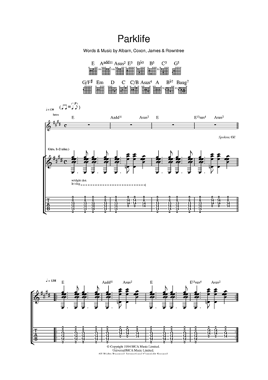 Digital Sheet Music for Parklife by Damon Albarn, Blur, Graham Coxon, Alex James, Dave Rowntree scored for Guitar Tab; id:393146