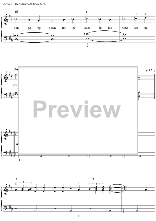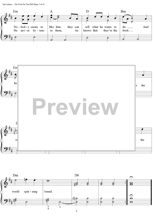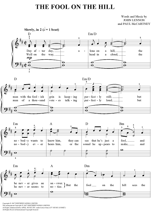Digital Sheet Music for The Fool on the Hill by Paul McCartney, The Beatles, John Lennon scored for Easy Piano/Vocal/Chords; id:449561