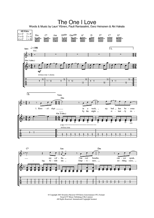 Digital Sheet Music for The One I Love by Eero Heinonen, Pauli Rantasalmi, The Rasmus, Lintu scored for Guitar Tab; id:382940