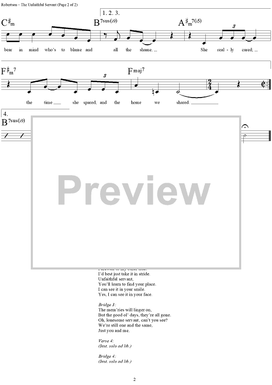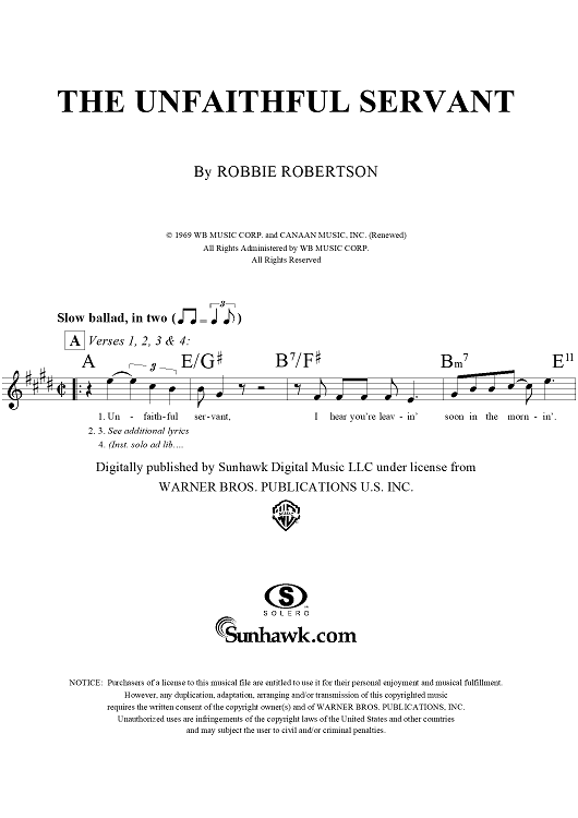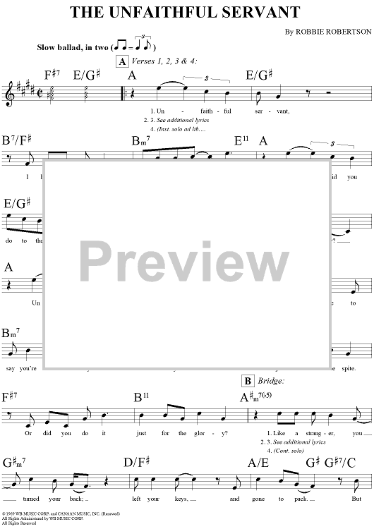 Digital Sheet Music for The Unfaithful Servant by Robbie Robertson, The Band scored for Lead Sheet; id:293809