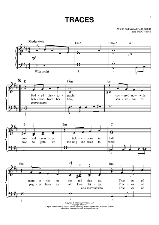 Digital Sheet Music for Traces by Buddy Buie, The Classics IV, J. R. Cobb scored for Easy Piano; id:369266