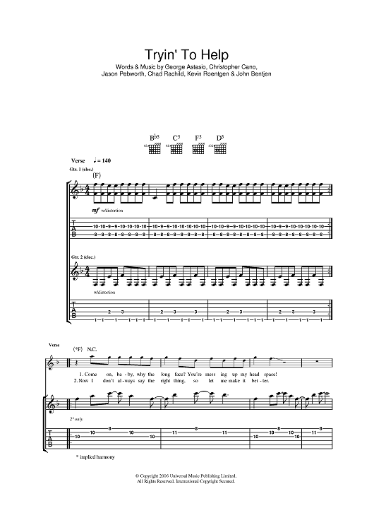 Digital Sheet Music for Tryin' To Help by George Astasio, John Bentjen, Christopher Cano, Orson, Jason Pebworth, Chad Rachild, Kevin Roentgen scored for Guitar Tab; id:391429