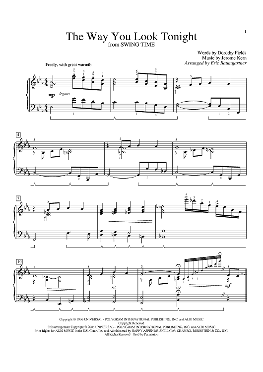 Digital Sheet Music for The Way You Look Tonight by Frank Sinatra, Fred Astaire, Billie Holiday, Rod Stewart, Jerome Kern, Dorothy Fields, Michael Buble, Slick Rick scored for Piano; id:394834