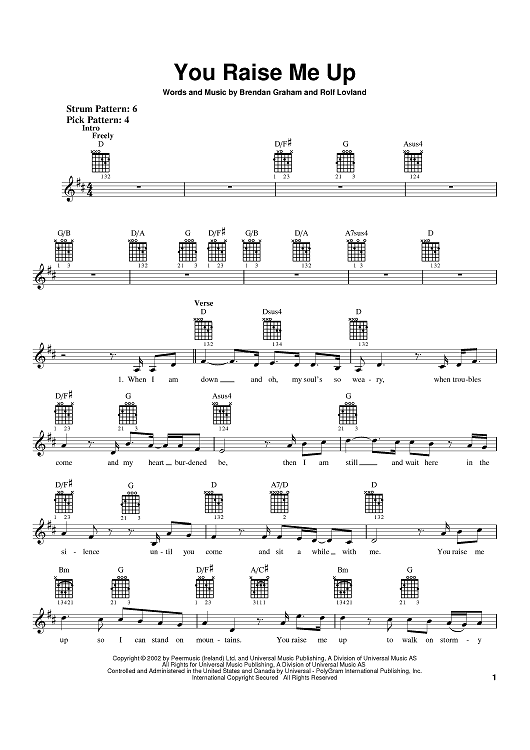 Digital Sheet Music for You Raise Me Up by Rolf Lovland, Josh Groban, Brendan Graham, Secret Garden scored for Lead Sheet with Guitar Grids; id:383086