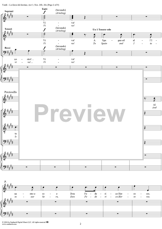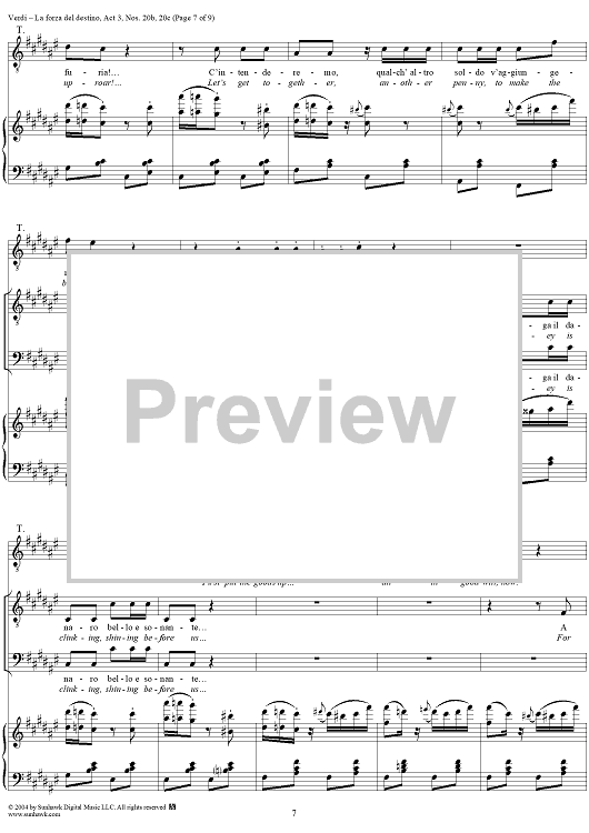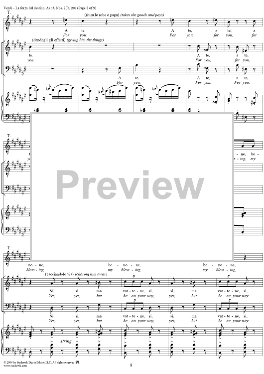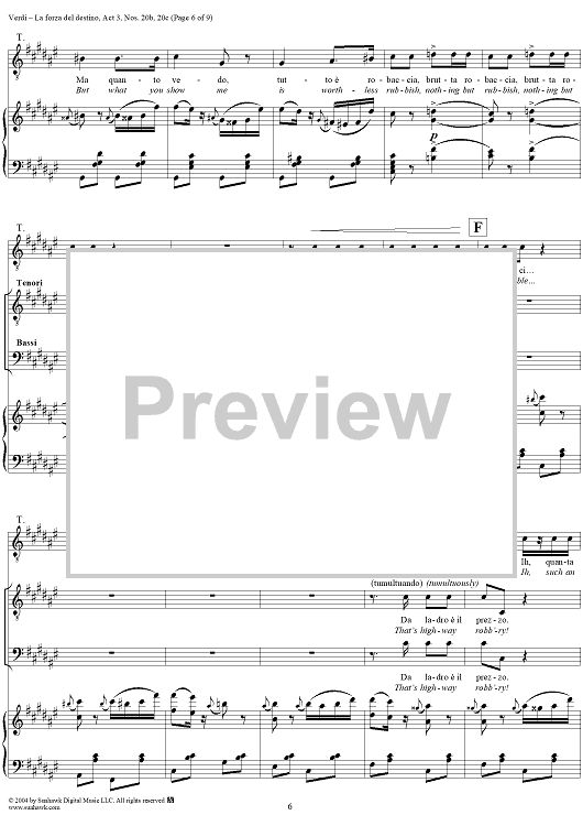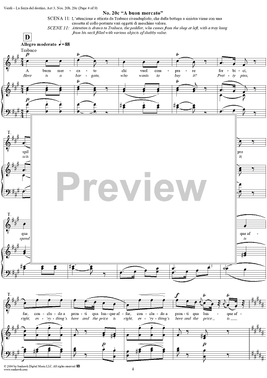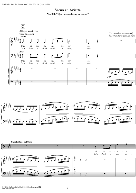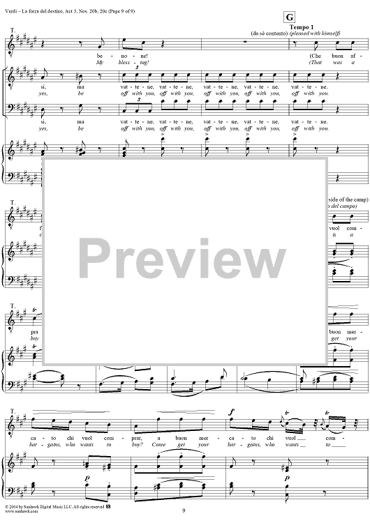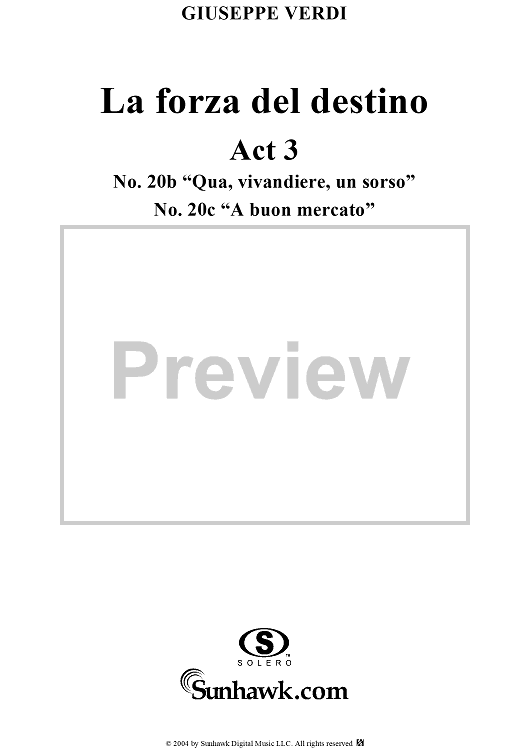 Digital Sheet Music for La forza del destino, Act 3, Nos. 20b and 20c, Scene and Aria. "Qua, vivandiere, un sorso" and "A buon mercato" - Score by Giuseppe Verdi scored for Vocal Score; id:305203