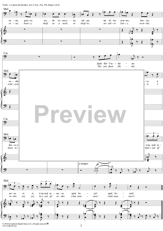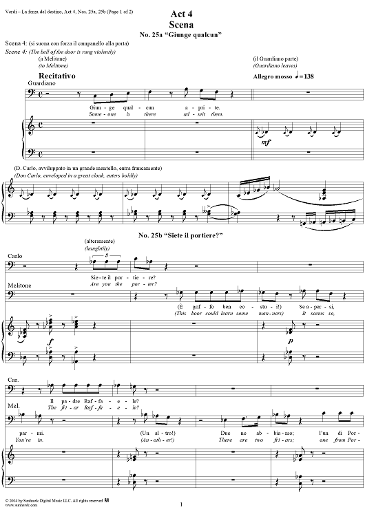 Digital Sheet Music for La forza del destino, Act 4, Nos. 25a and 25b, Scene. "Giunge gualcun" and "Siete il portiere?" - Score by Giuseppe Verdi scored for Vocal Score; id:305230
