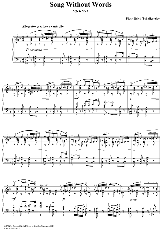 "Three pieces ''Souvenir de Hapsal''. No. 3. Song Without Words" Sheet Music by Peter Ilyich Tchaikovsky