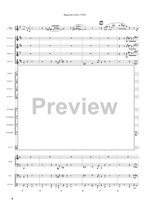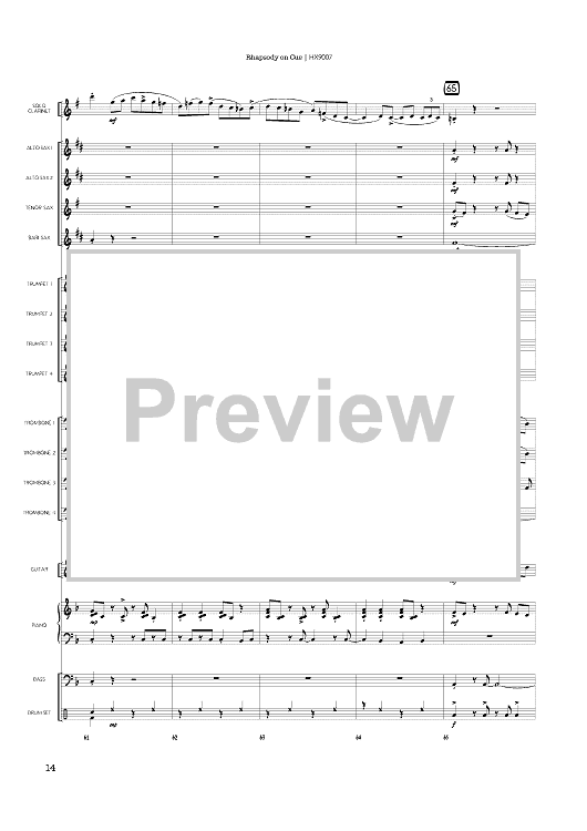 Here's an ebullient and flashy solo feature for clarinet and big band. The ensemble swings brightly with intricate but accessible orchestrations while the bouncy solo shines with riffs and glissandi. A transcription of the improvised portion of the solo is provided. The top trumpet note is A. This is serious literature for any clarinetist to consider!