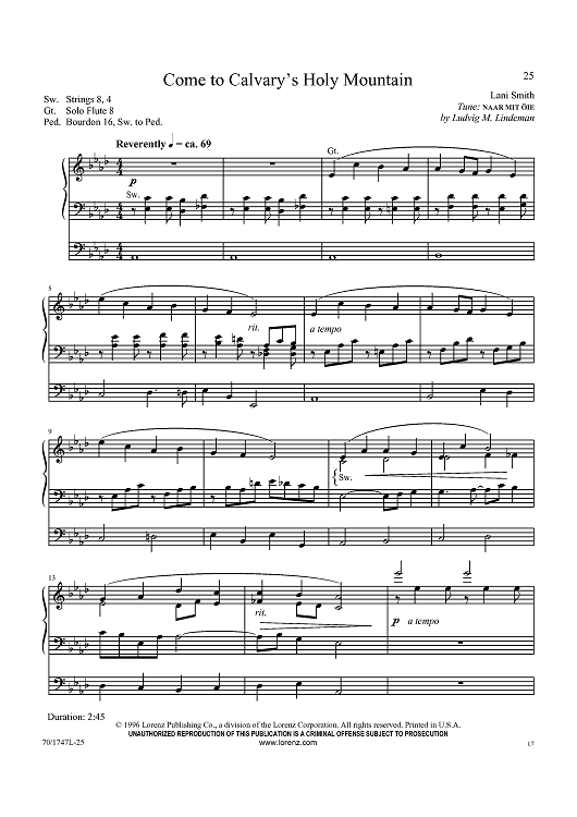 Digital Sheet Music for Come to Calvary’s Holy Mountain by Ludvig M. Lindeman, Lani Smith scored for Organ Solo; id:437647
