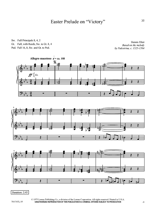 Digital Sheet Music for Easter Prelude on “Victory” by Giovanni Pierluigi da Palestrina, Dennis Eliot scored for Organ Solo; id:437650