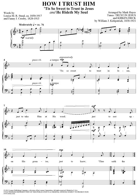 Digital Sheet Music for How I Trust Him by Mark Hayes, Louisa M. R. Stead, Fanny Crosby, William J. Kirkpatrick scored for Piano/Vocal; id:435221