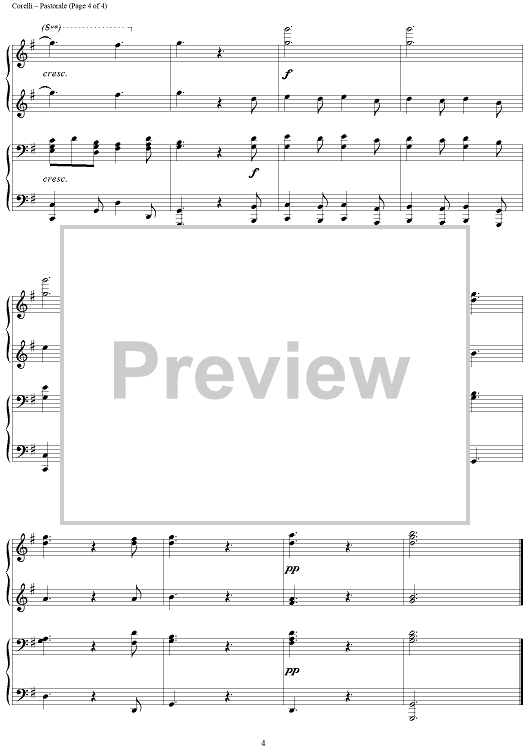 Digital Sheet Music for Pastorale (from the Christmas Concerto, op. 6, no. 8) by Arcangelo Corelli, Larry Shackley scored for 1 Piano, 4 Hands; id:434821