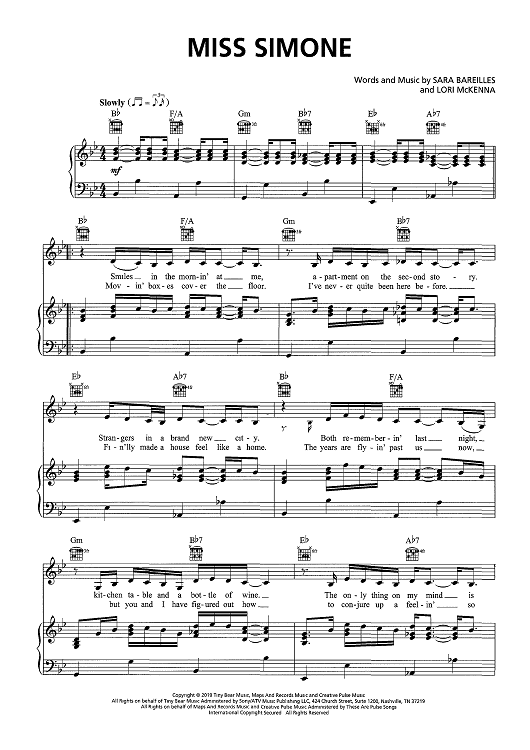 Digital Sheet Music for Miss Simone by Sara Bareilles, Lori McKenna scored for Piano/Vocal/Chords; id:467878