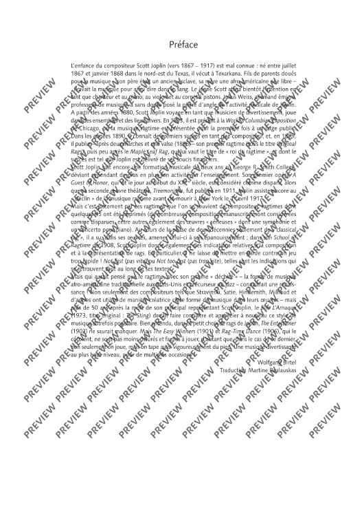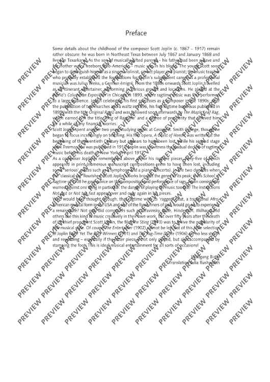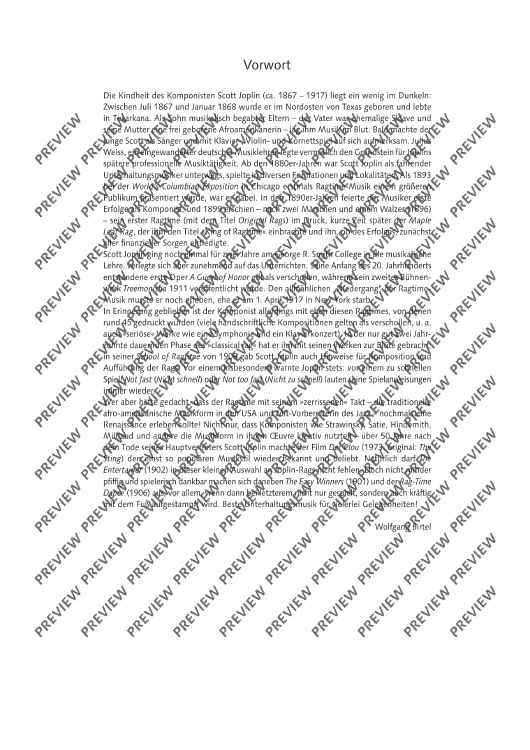 Who would have thought that ragtime would enjoy another renaissance! But more than 50 years after the death of its main representative, Scott Joplin, the film 'The Sting' has made this once popular style well-known and fashionable again. This small selection of Joplin rags is of course not complete without 'The Entertainer'. In comparison, 'Easy Winners' and 'Rag-Time Dance' are no less fun to play, particularly since in the latter the performer not only has to play but also stomp his foot. Excellent music providing entertainment for many occasions!