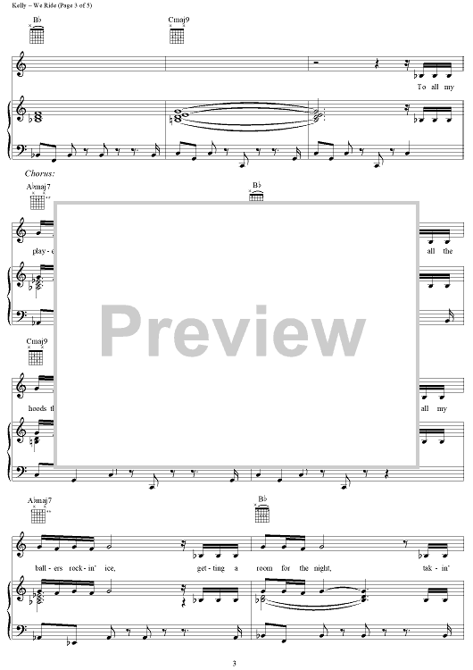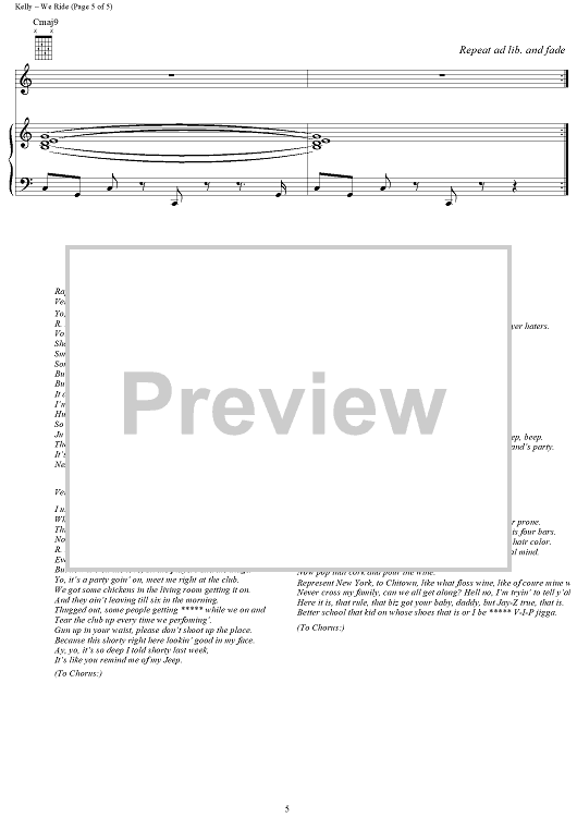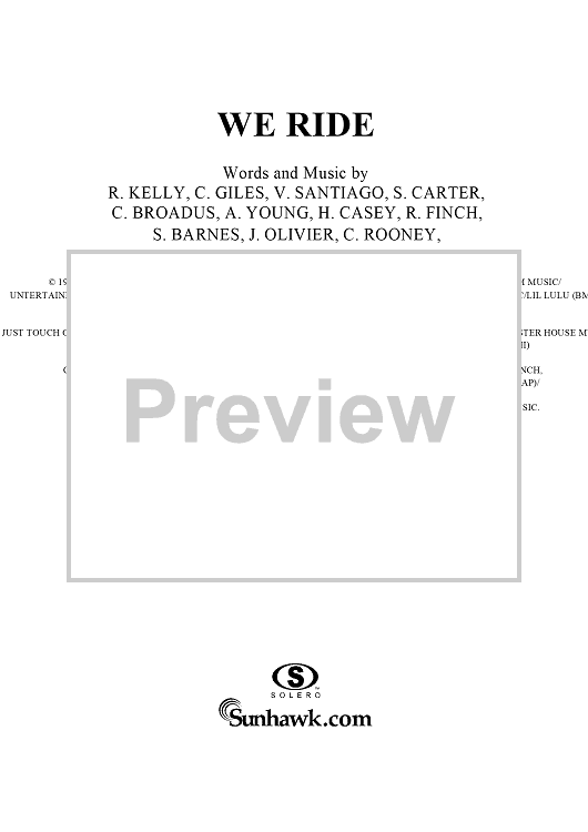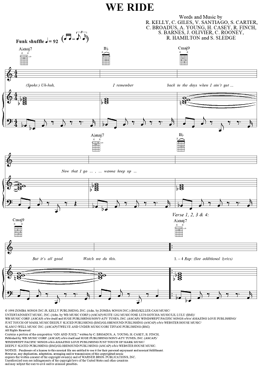 Digital Sheet Music for We Ride by R. Kelly, KC, R. Finch, Russell Hamilton, Victor Santiago, S. Sledge, Andre Young, Cameron Giles, Cory Rooney, Shawn Carter, Samuel Barnes, Jean Claude Olivier, Calvin Broadus scored for Piano/Vocal/Chords; id:250165