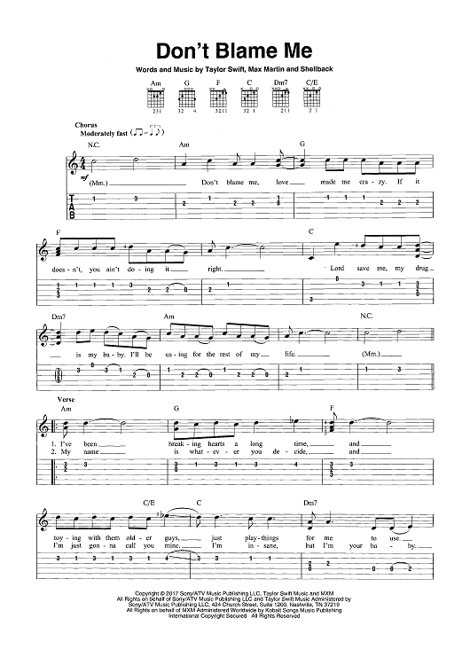 Digital Sheet Music for Don't Blame Me by Max Martin, Taylor Swift, Shellback scored for Easy Guitar Tab/Vocal; id:466096