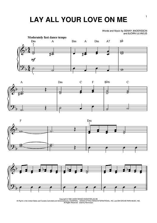 Digital Sheet Music for Lay All Your Love On Me by ABBA, Benny Andersson, Bjorn Ulvaeus scored for Easy Piano; id:391890