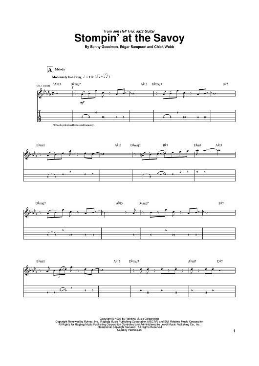 Digital Sheet Music for Stompin' At The Savoy by Chick Webb, Benny Goodman, Andy Razaf, Edgar Sampson, Jim Hall scored for Guitar Tab; id:387788