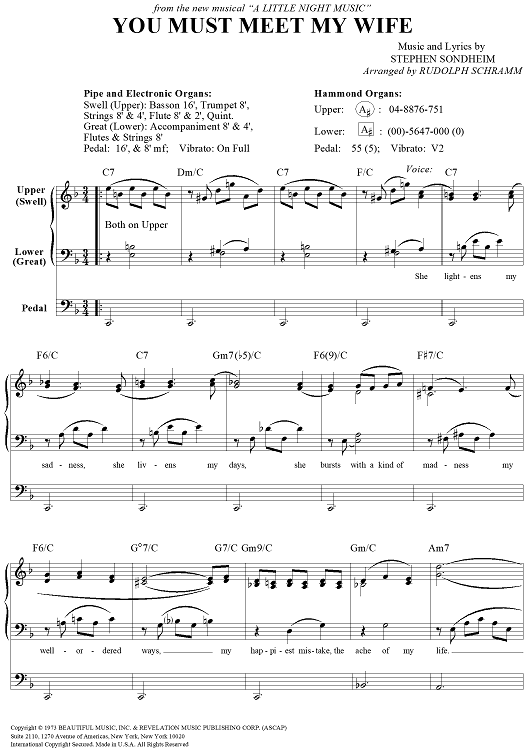 Digital Sheet Music for You Must Meet My Wife by Stephen Sondheim, Rudolph Schramm scored for Easy Organ/Vocal; id:257809