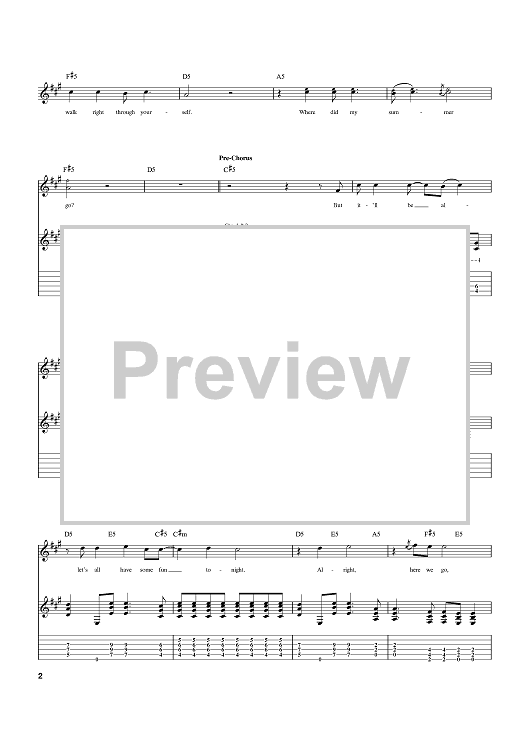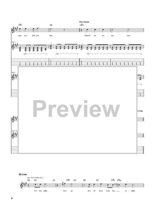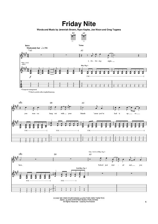 Digital Sheet Music for Friday Nite by Jeremiah Brown, Ryan Kepke, Joe Nixon, Slick Shoes scored for Guitar Tab; id:372542