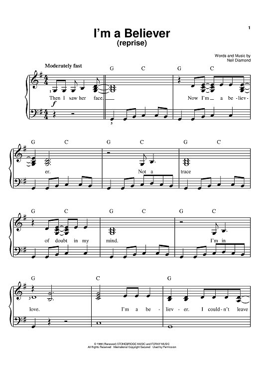 Digital Sheet Music for I'm A Believer (Reprise) by Neil Diamond, The Monkees, Smash Mouth scored for Easy Piano; id:396873