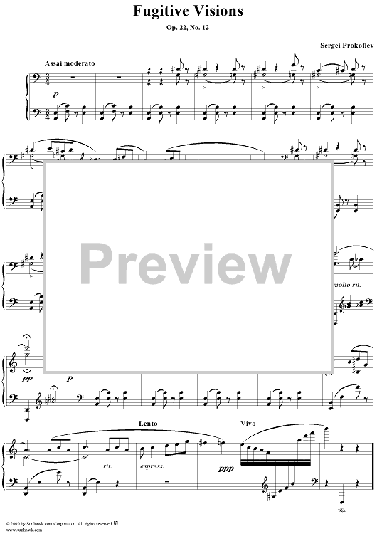 Digital Sheet Music for Fugitive Visions, op. 22, no. 12 (Assai moderato) by Sergei Prokofiev scored for Piano Solo; id:235302