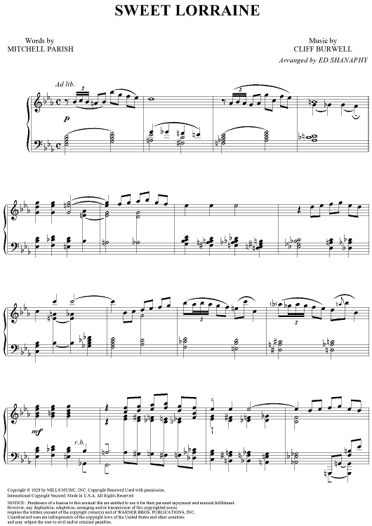 Digital Sheet Music for Sweet Lorraine by Mitchell Parish, Cliff Burwell, Edward Shanaphy scored for Piano Solo; id:273628