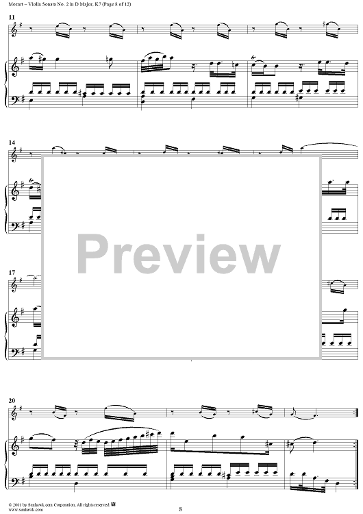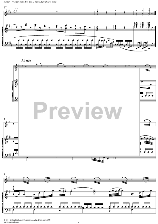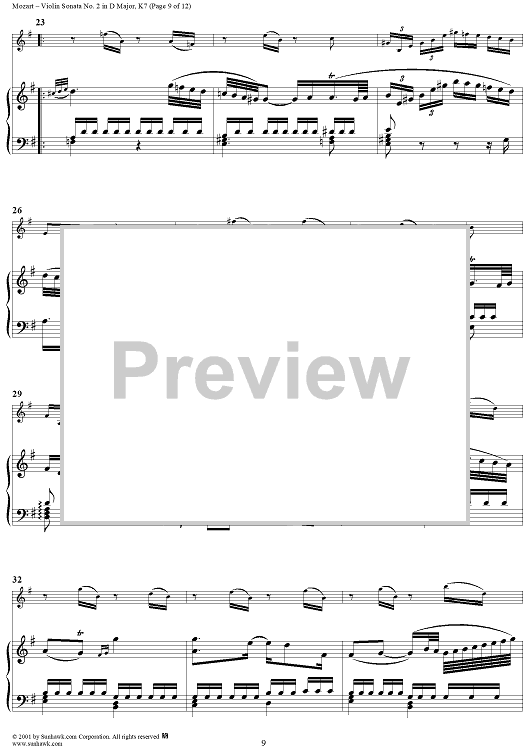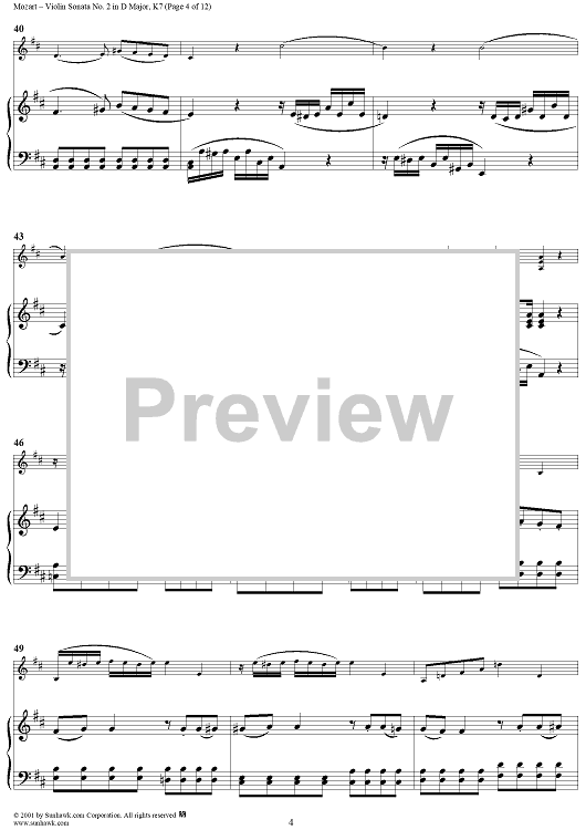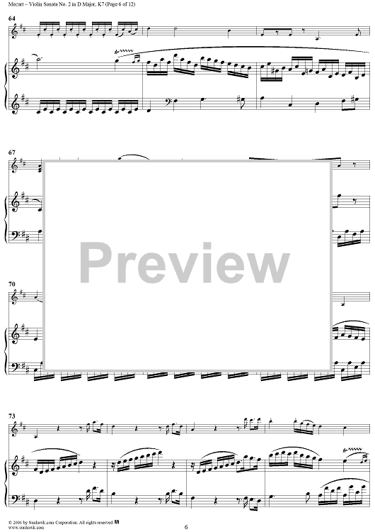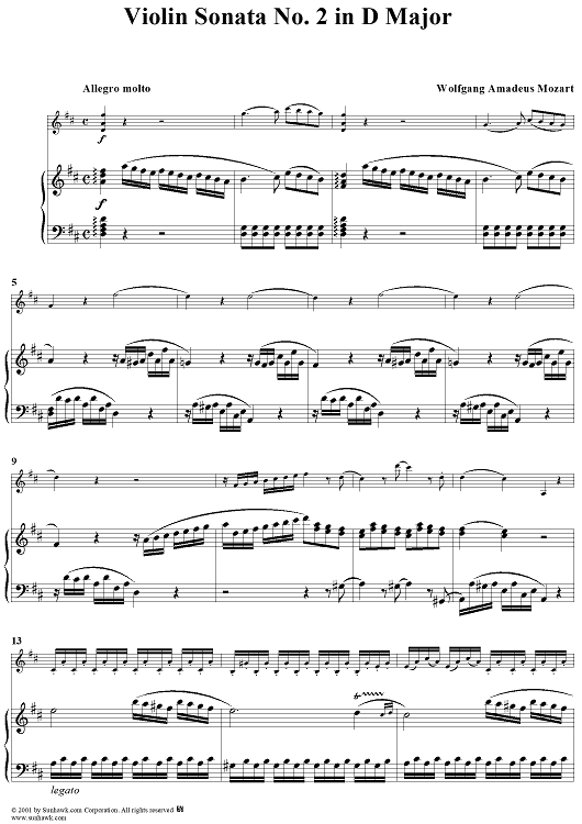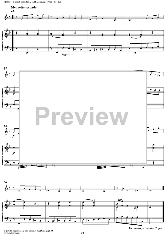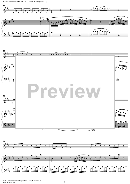 Digital Sheet Music for Violin Sonata no. 2 in D Major by Wolfgang Amadeus Mozart scored for Violin/Piano; id:94690