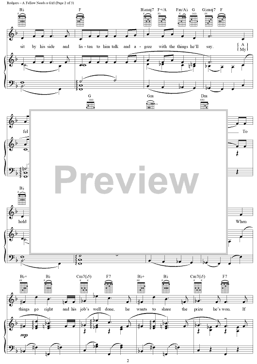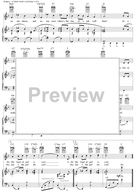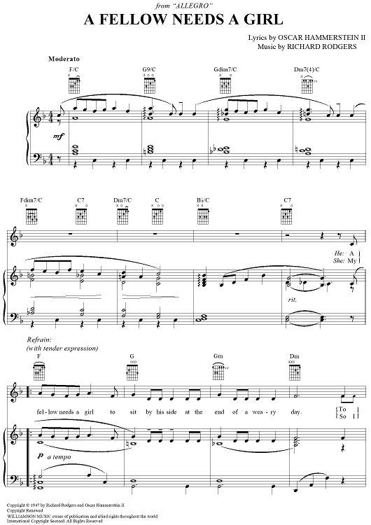 Digital Sheet Music for A Fellow Needs a Girl by Richard Rodgers, Oscar Hammerstein II scored for Piano/Vocal/Chords; id:367045