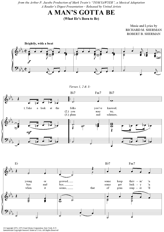 Digital Sheet Music for A Man's Gotta Be (What He's Born to Be) by Richard M. Sherman, Robert B. Sherman scored for Piano/Vocal/Chords; id:366129