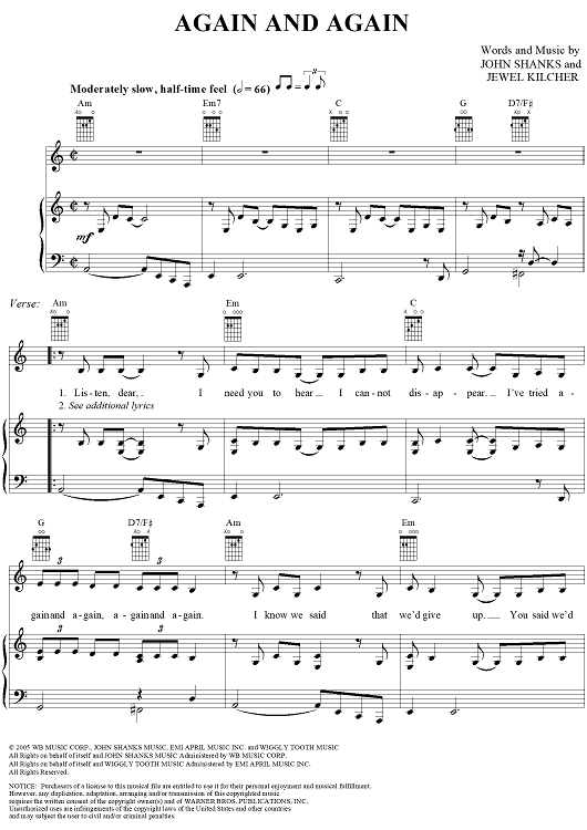 Digital Sheet Music for Again and Again by Jewel, John Shanks, Jewel Kilcher scored for Piano/Vocal/Chords; id:320758