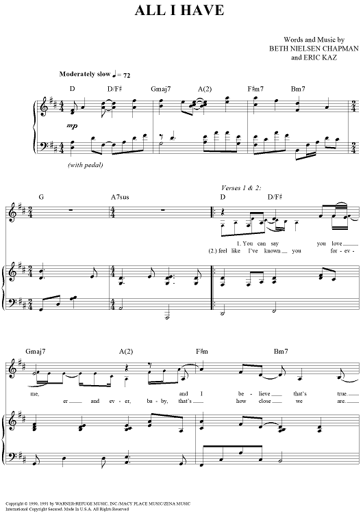 Digital Sheet Music for All I Have by Beth Nielsen Chapman, Eric Kaz scored for Piano/Vocal/Chords; id:132915