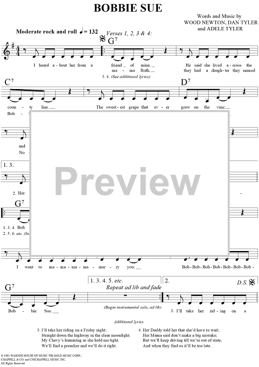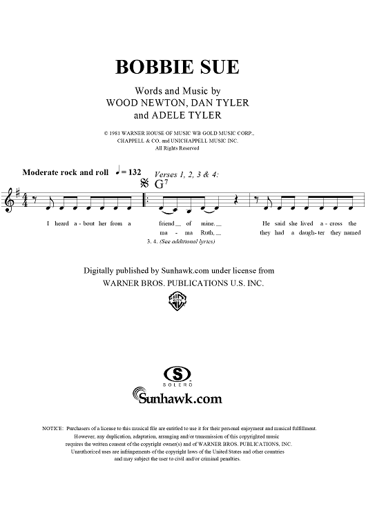 Digital Sheet Music for Bobbie Sue by Dan Tyler, Wood Newton, Adele Tyler, The Oak Ridge Boys scored for Lead Sheet; id:135507