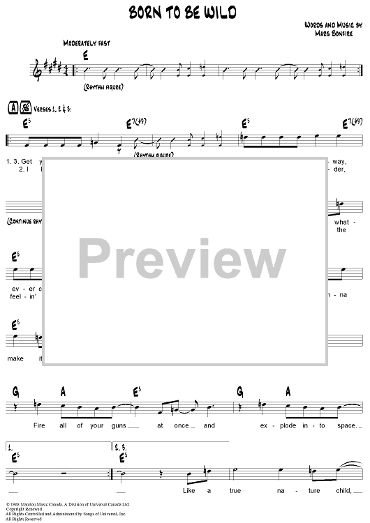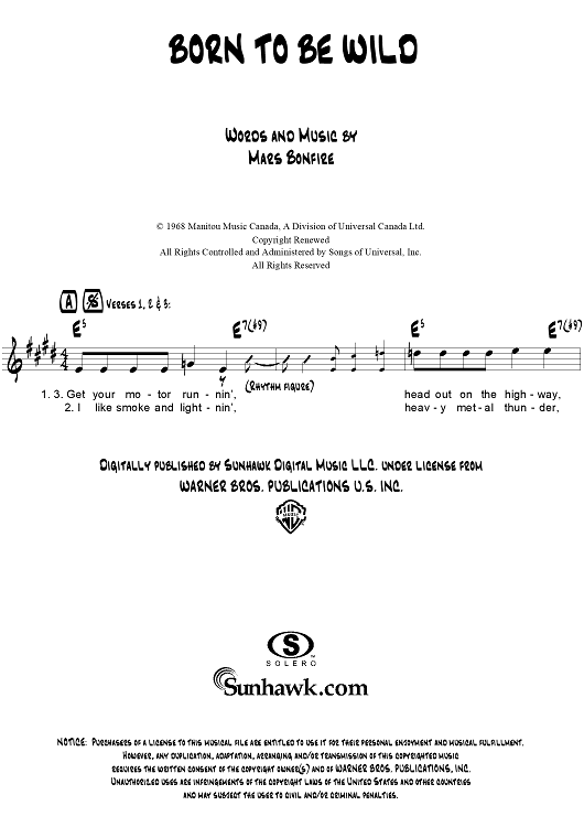 Digital Sheet Music for Born To Be Wild by Steppenwolf, Mars Bonfire scored for Lead Sheet; id:307675