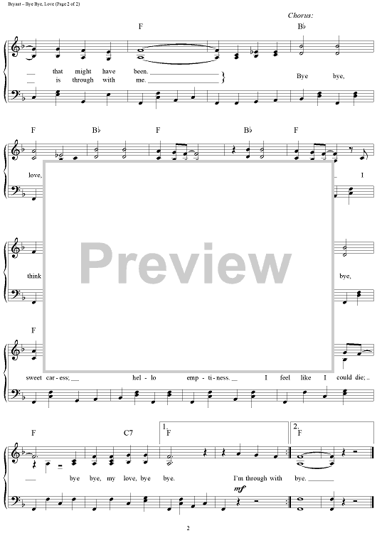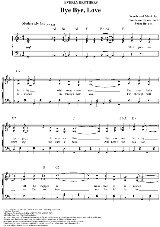 Digital Sheet Music for Bye Bye, Love by Boudleaux Bryant, Felice Bryant, The Everly Brothers scored for Piano/Vocal/Chords; id:111055