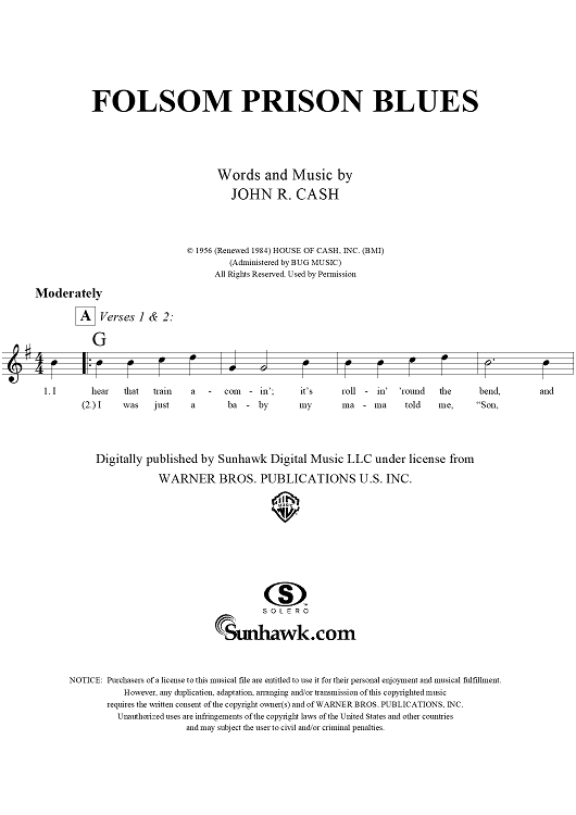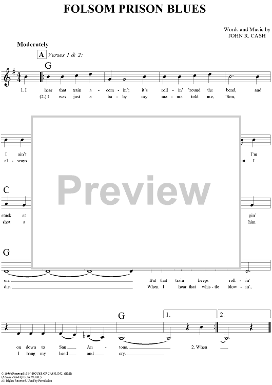 "Folsom Prison Blues" Sheet Music by Johnny Cash