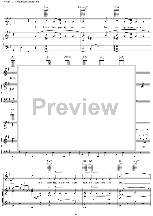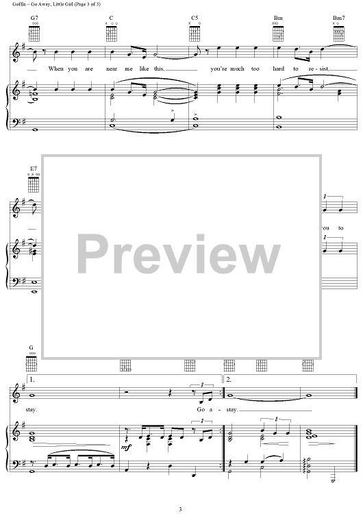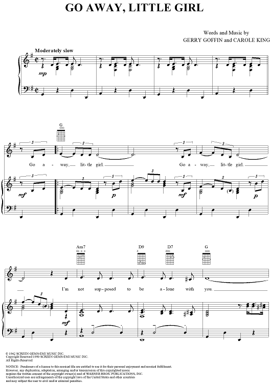 Digital Sheet Music for Go Away, Little Girl by Carole King, Donny Osmond, Steve Lawrence, The Happenings, Gerry Goffin scored for Piano/Vocal/Chords; id:114131