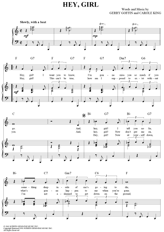 Digital Sheet Music for Hey, Girl by Carole King, Gerry Goffin scored for Piano/Vocal/Chords; id:120801
