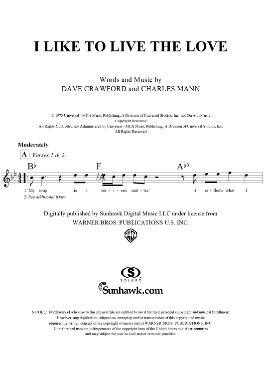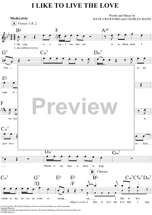 Digital Sheet Music for I Like to Live the Love by Dave Crawford, Charles Mann scored for Lead Sheet; id:291284