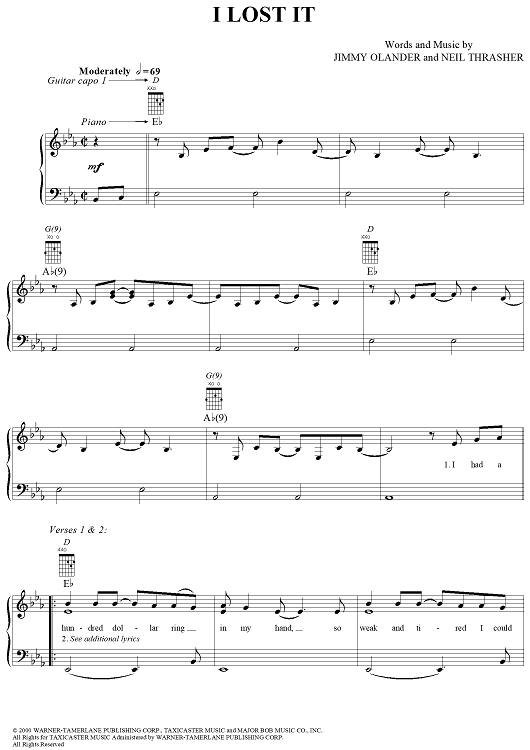 Digital Sheet Music for I Lost It by Kenny Chesney, Neil Thrasher, Jimmy Olander scored for Piano/Vocal/Chords; id:288565