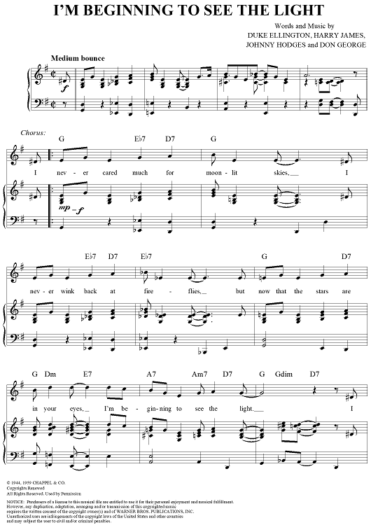 Digital Sheet Music for I'm Beginning to See the Light by Duke Ellington, Ella Fitzgerald, Johnny Hodges, Don George, Harry James scored for Piano/Vocal/Chords; id:125735