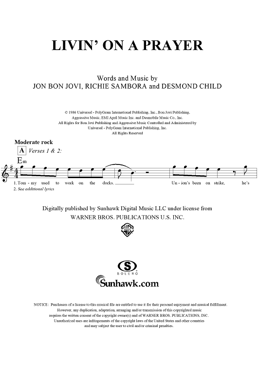 "Livin' on a Prayer" Sheet Music by Bon Jovi