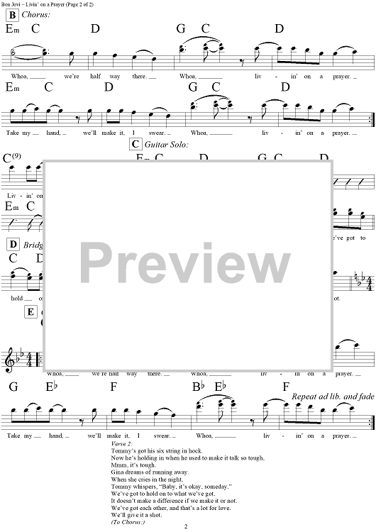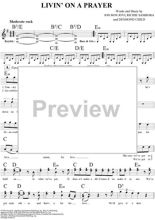 Digital Sheet Music for Livin' on a Prayer by Bon Jovi, Richie Sambora, Desmond Child, Jon Bon Jovi scored for Lead Sheet; id:293992